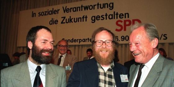 Im Herbst 1989 gründete Markus Meckel die Sozialdemokratische Partei im Ostteil Deutschlands (SDP). Hiermit ist er mit Wolfgang Thierse und Willy Brandt auf dem Parteitag am 24. Februar 1990 zu sehen, an dem auch Willy Brandt zum Ehrenvorsitzenden der SDP gewählt wurde.